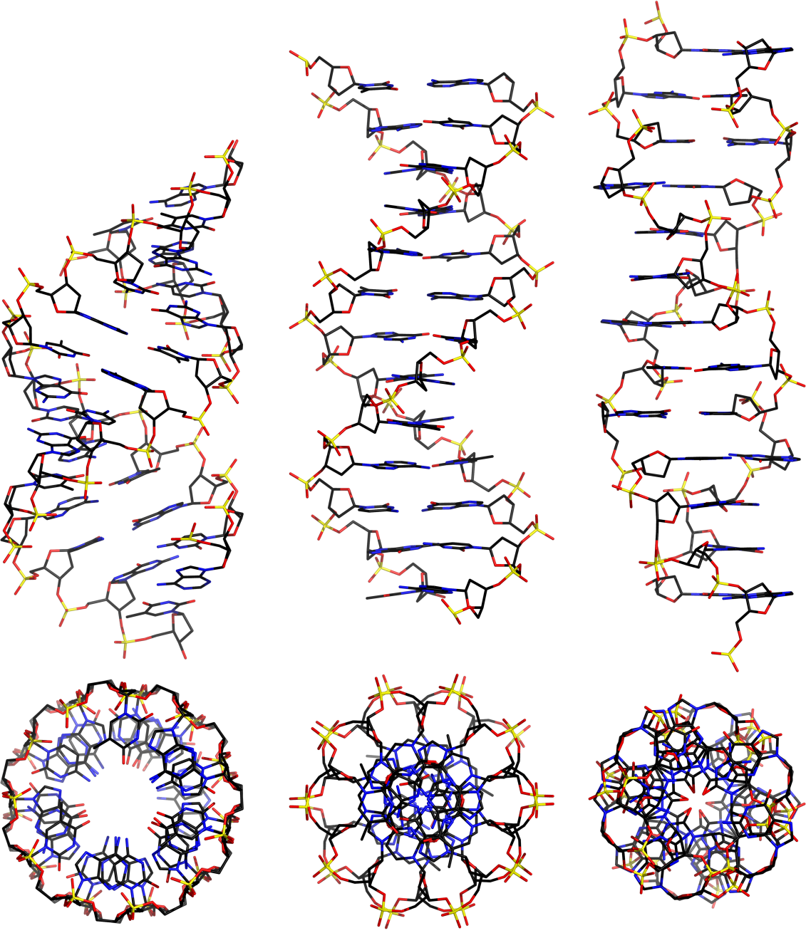 Main DNA conformations from Arnott fiber models.