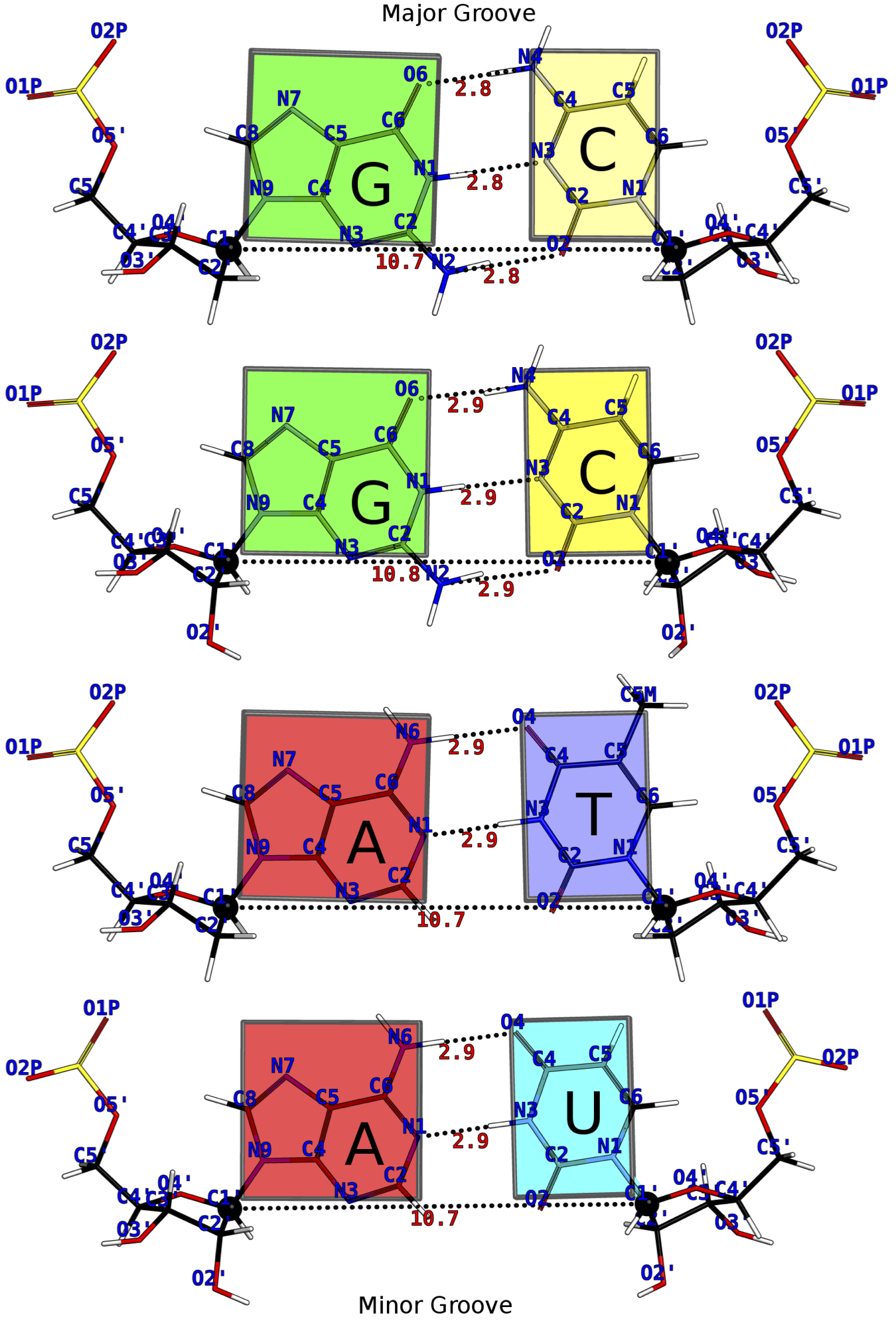 Canonical Watson-Crick DNA and RNA base-pairs in Calladine-Drew Representation.