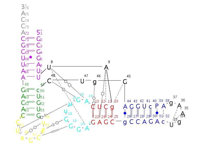 tRNA secondary structure using Leontis-Westhof annotation styles.